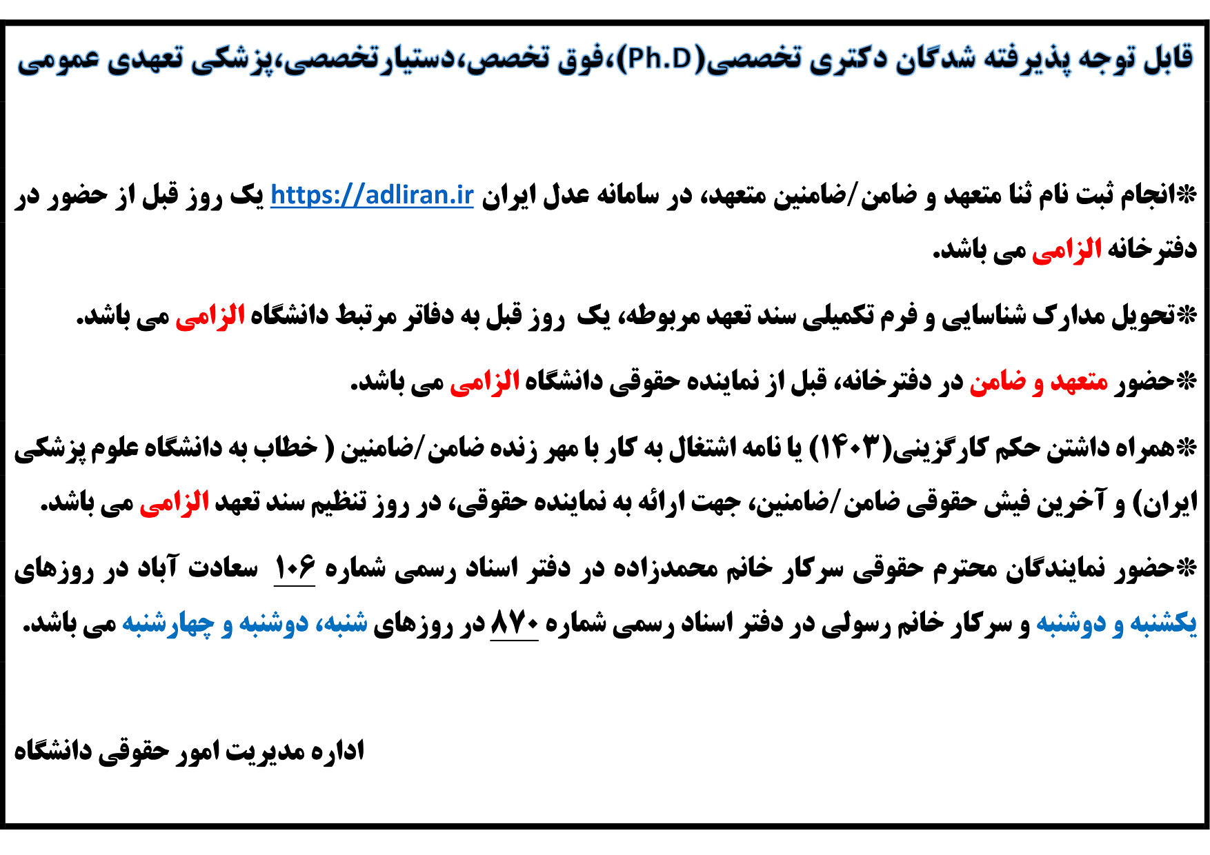 اطلاعیه ویژه دفتر حقوقی دانشگاه درخصوص پذیرفته شدگان فوق تخصص، دستیار تخصصی، دکترای تخصصی و پزشکی عمومی تعهدی سال1404